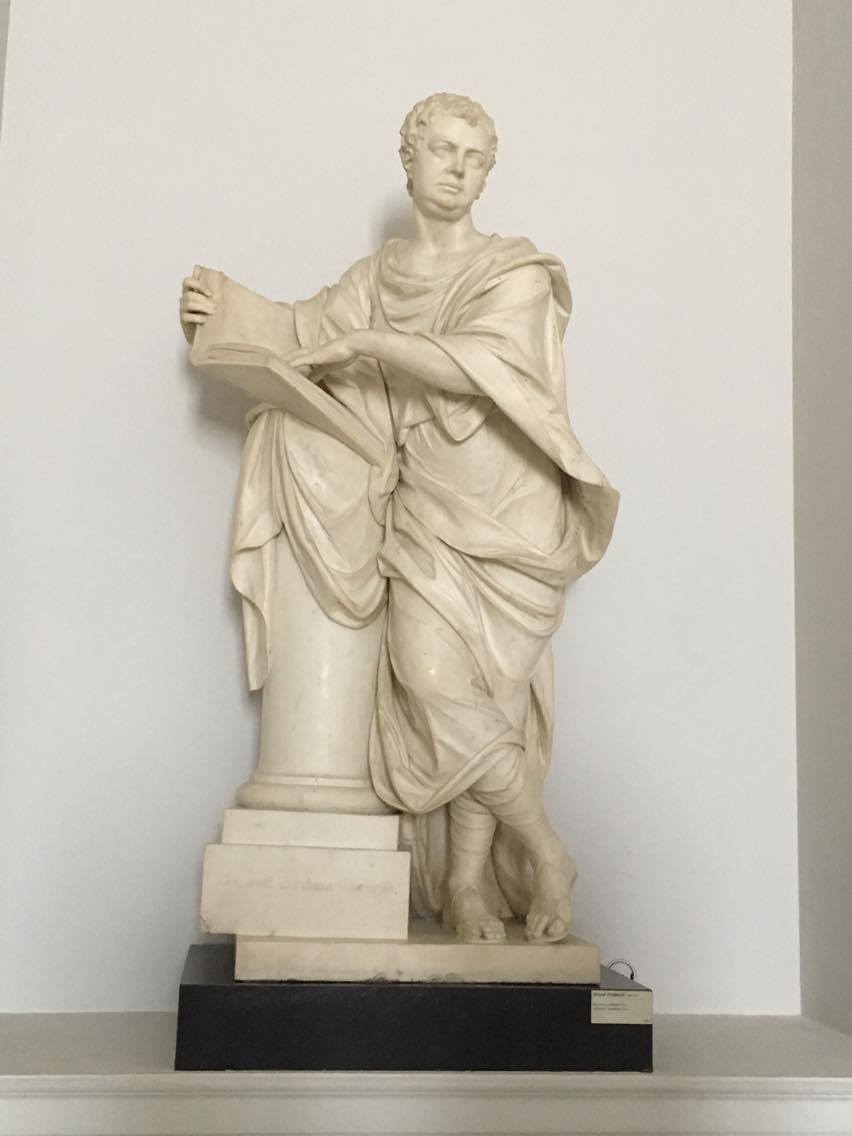 John Willett, a Magistrate, has been sculpted reading a book presumed to be related to his career. He’s also leaning on a column and dressed in a toga-style outfit. Though sculpted in 1763, Willett actually died in 1745, almost exactly 20 years before his sculpture was created. We assume the sculpture commissioner was Ralph Willett, his nephew, as it is his will that expresses his wish to keep the statue of his uncle in the Grand Entrance Hall of Merley House.